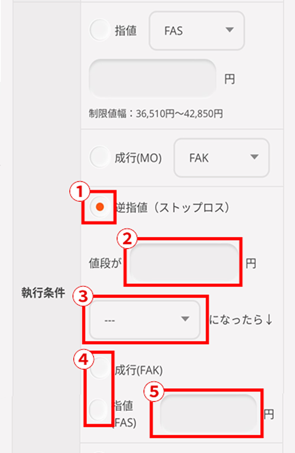 逆指値(ストップロス)が発動する際、発注する注文については、約定を優先する場合は成行を、指定した価格での約定を優先する場合は指値を選択します。