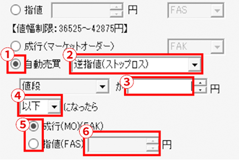 ⑤設定したロスカットが発動したとき、発注する注文を成行、または指値のいずれかを選択する。
