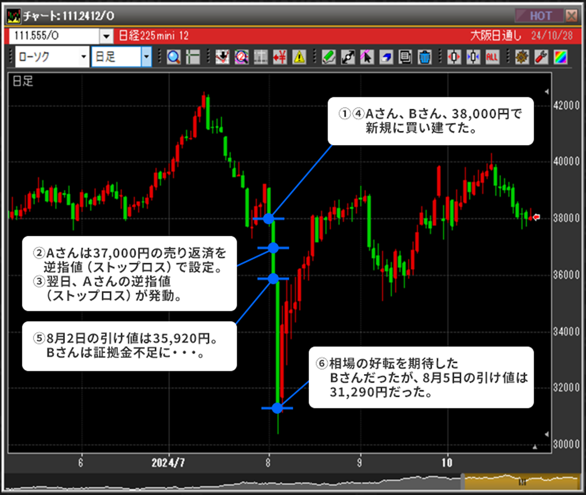 ②相場の急落に備え、37,000円で3枚売り返済の逆指値(ストップロス)を設定した。