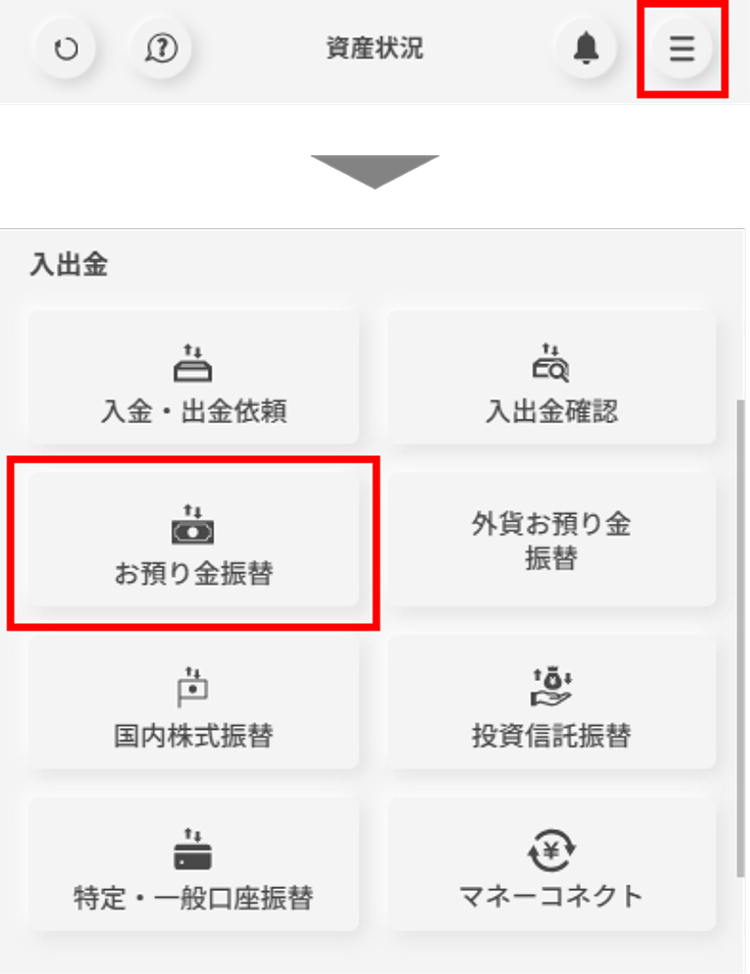 画面右上の(≡)アイコンをタップし、「お預り金振替」をタップします。