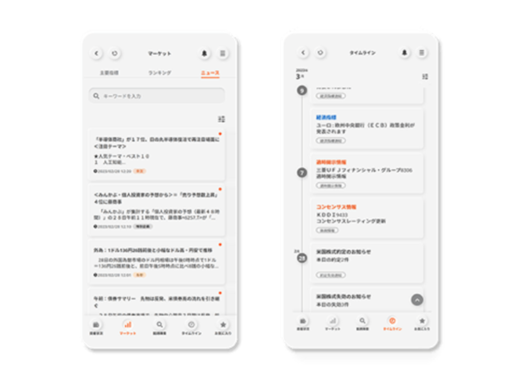 タイムライン機能ではお客さまのお取引情報だけでなく、キャンペーン情報や決算情報、経済指標など、お客さまの知りたい通知を時系列で配信します。またPush通知でもタイムラインで配信されている情報を通知いたしますので、更新情報をすばやくキャッチアップできるようになります。