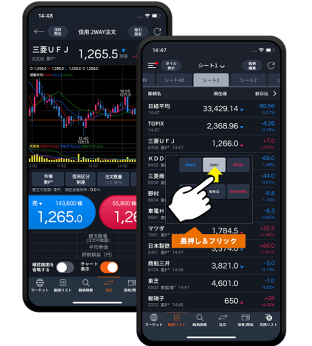 3つの発注方法(2WAY注文・板発注・発注パネル)の中から投資スタイルに応じて選べる!発注したい銘柄を長押し&フリック操作でシームレスに注文画面へ。