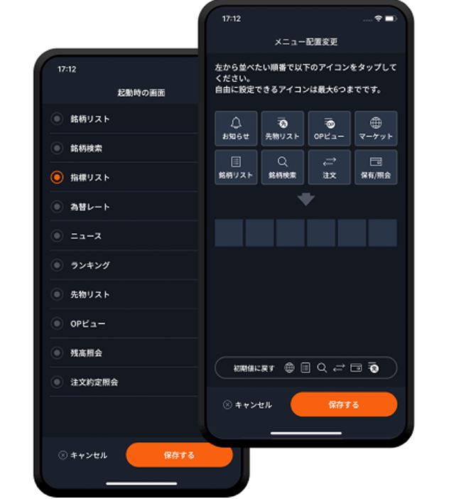 メニュー配置の並び替えや、アプリ起動時の表示画面などを設定できる!お客さま好みにカスタマイズできます。