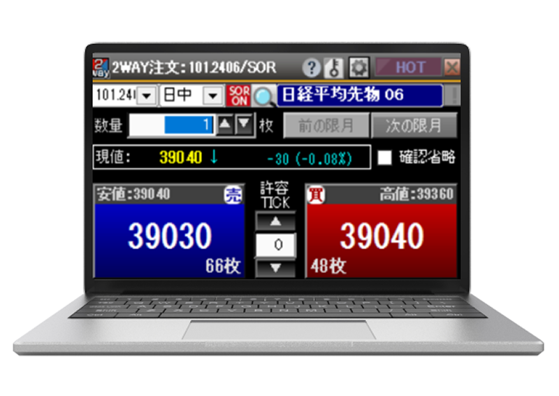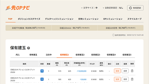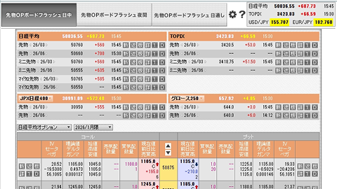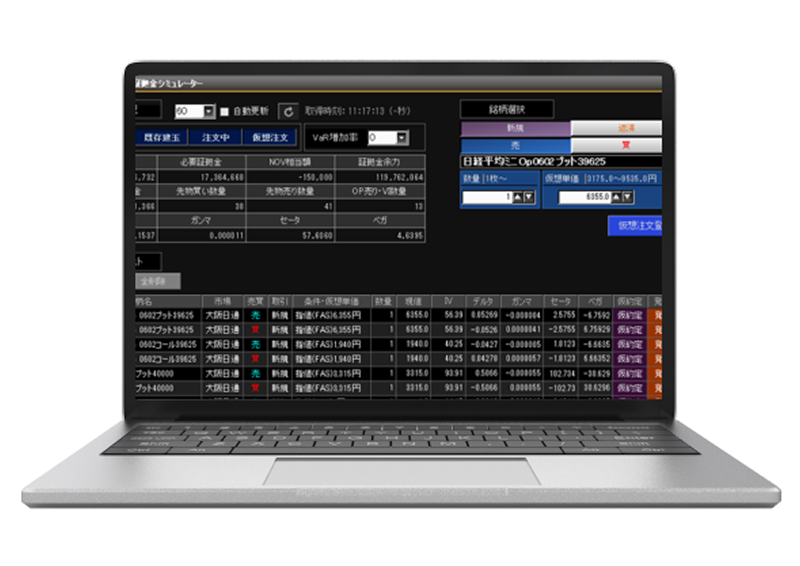 リアルタイム価格や建玉、出来高、VWAPなどの指標を一目で確認可能。値動きの激しい相場でもタイムロスなく判断できます。 証拠金シミュレーターや先OPナビなど、分析・資金管理サポート機能も充実!