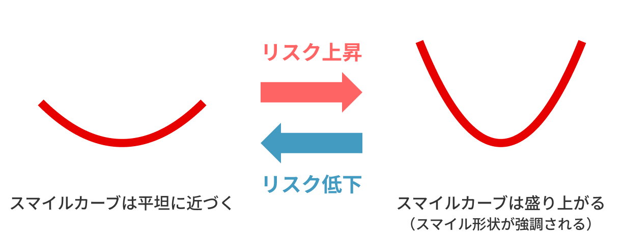 スマイルカーブの形状を観察することで、市場参加者のリスク許容度や不安心理を把握する手がかりを得ることができます。例えば、相場の大幅な変動が予想される局面や不確実性が高まる状況では、オプションへの需要が増加し、IVも上昇する傾向が見られます。