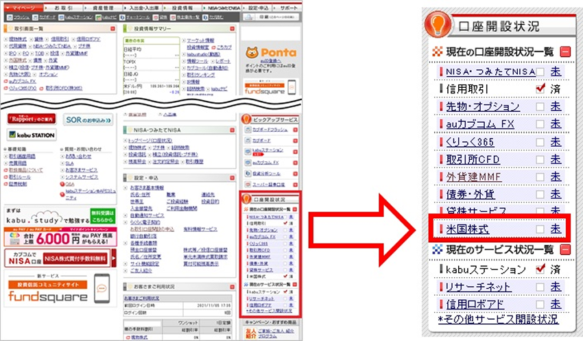 ログイン後、マイページ右側の「口座開設状況」内の「米国株式」をクリック