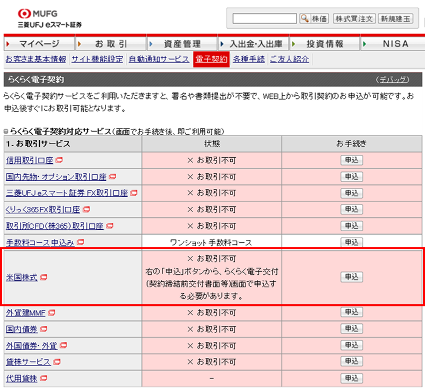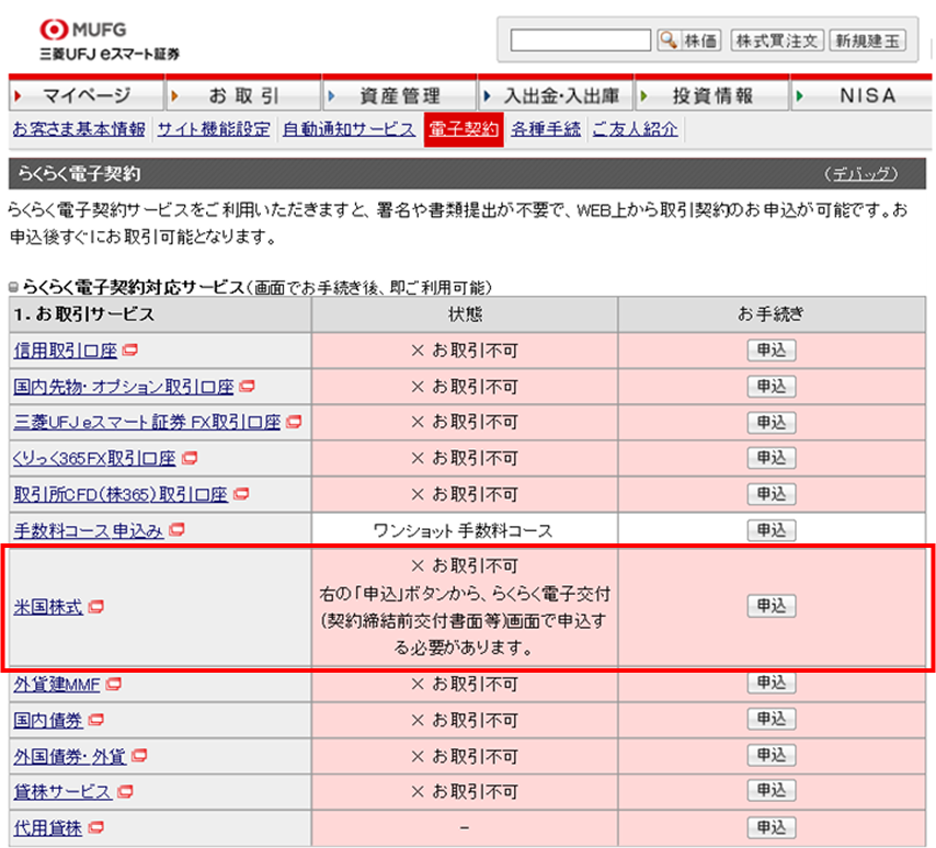 「らくらく電子契約」の「お取引サービス」の米国株式より「申込」ボタンを押下