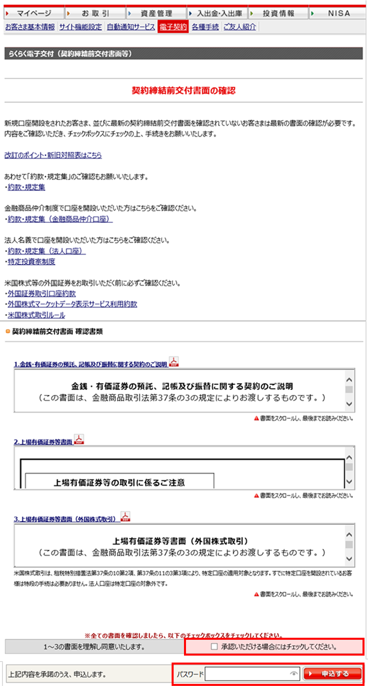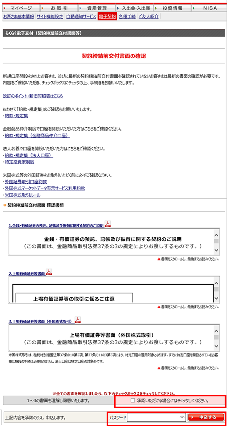 「契約締結前交付書面の確認」画面に遷移しますので、1~3の書面を最後まで一読いただき、ご理解、同意いただけましたらチェックボックスにチェックし、パスワードを入力のうえ「申込する」ボタンを押下してください。