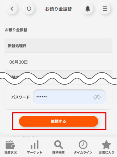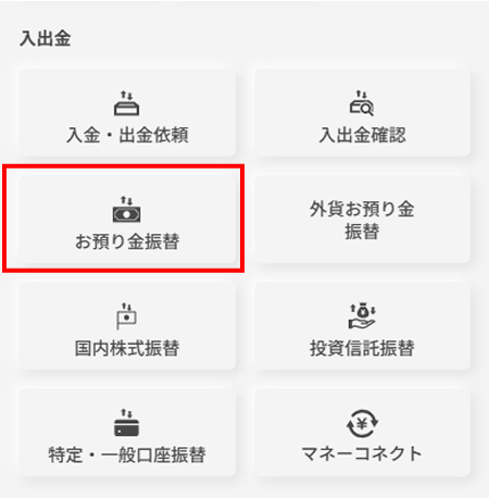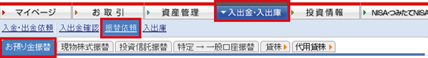 マイページの「入出金・入出庫」メニューより、「振替依頼」>「お預り金振替」を選択してください。