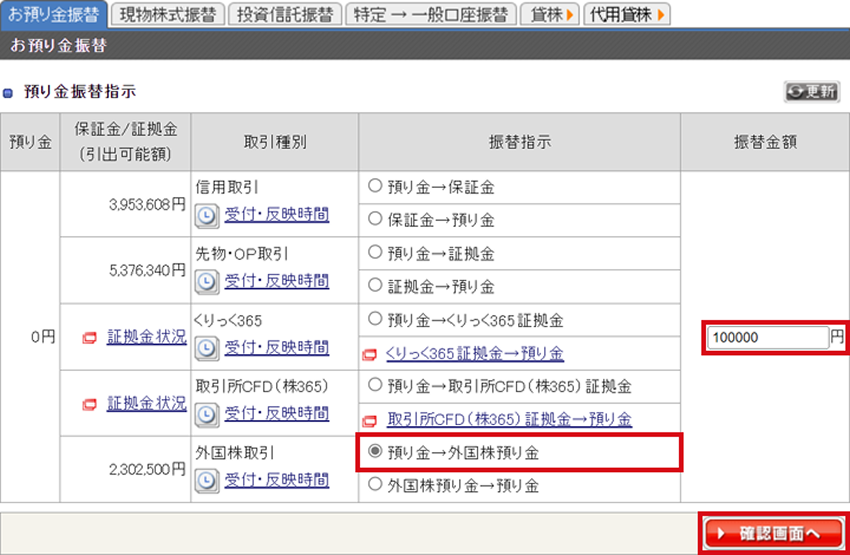 「預り金→外国株預り金」を選択し、振替金額を入力後「確認画面へ」ボタンをクリックします。
