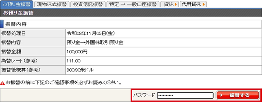 振替内容を確認し、間違いがなければパスワードを入力し「振替する」ボタンをクリック、外国株取引預り金へのお振替が完了します。