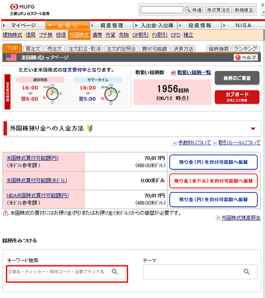 このページでは、保有している【預り金(円)】【預り金(ドル)】の残高や、米国市場の取引時間帯を確認できます。
