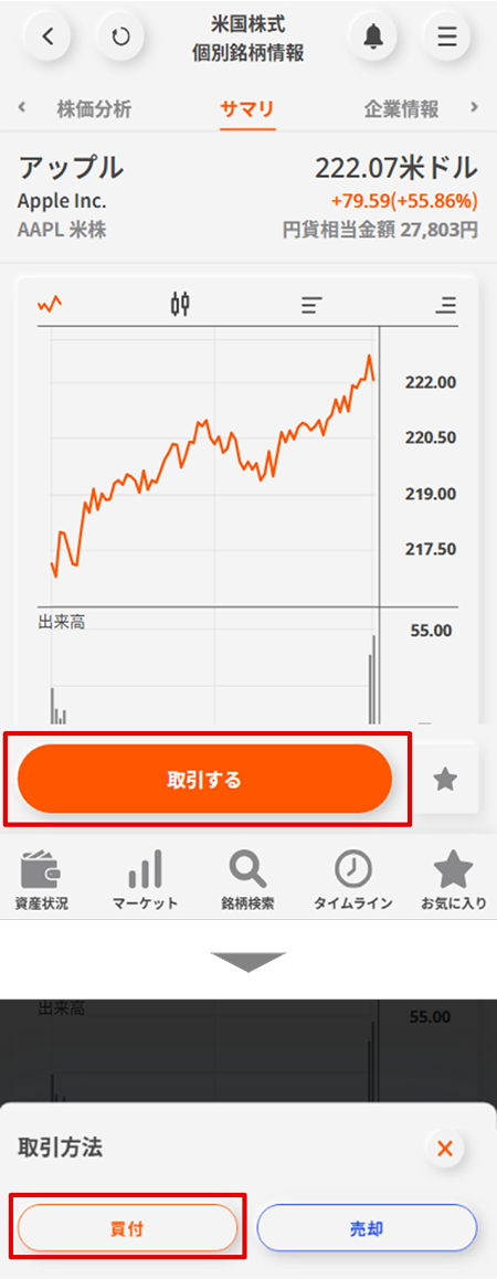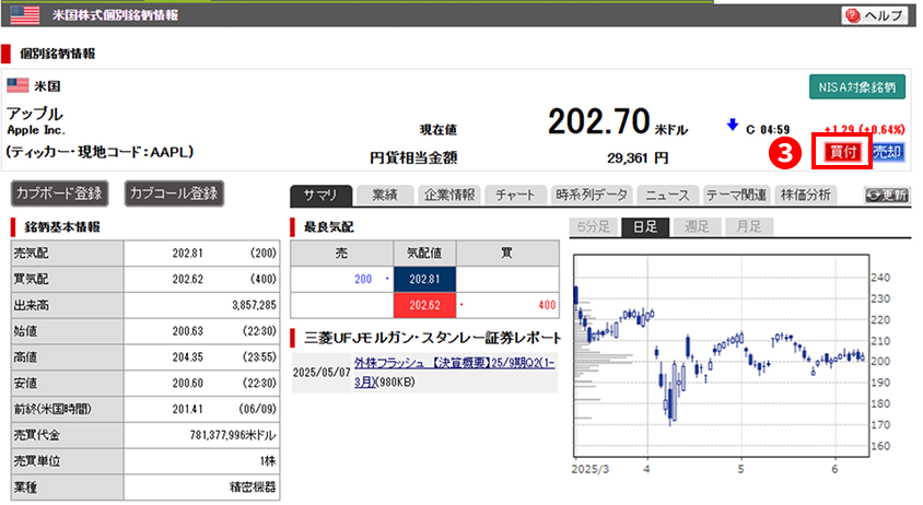 検索した銘柄をクリックすると「個別銘柄情報」へ遷移するので、「買付」ボタンをクリックします。