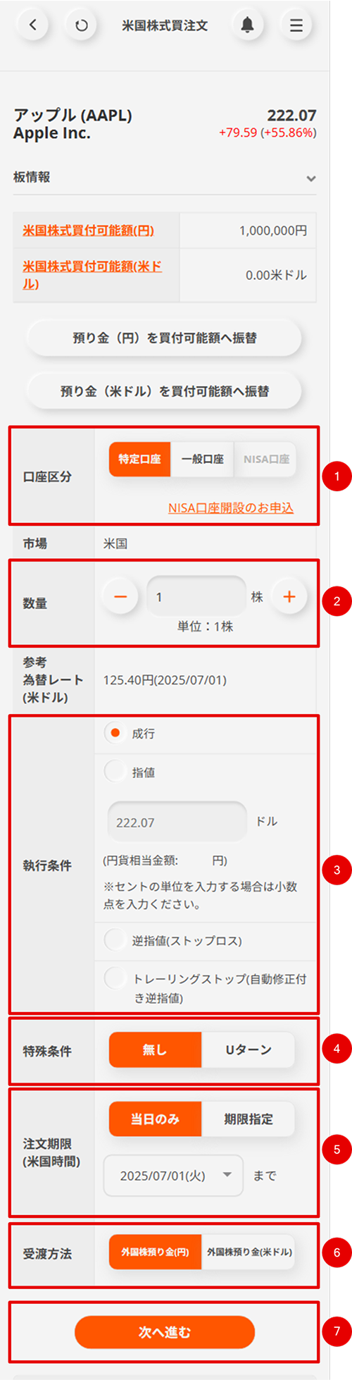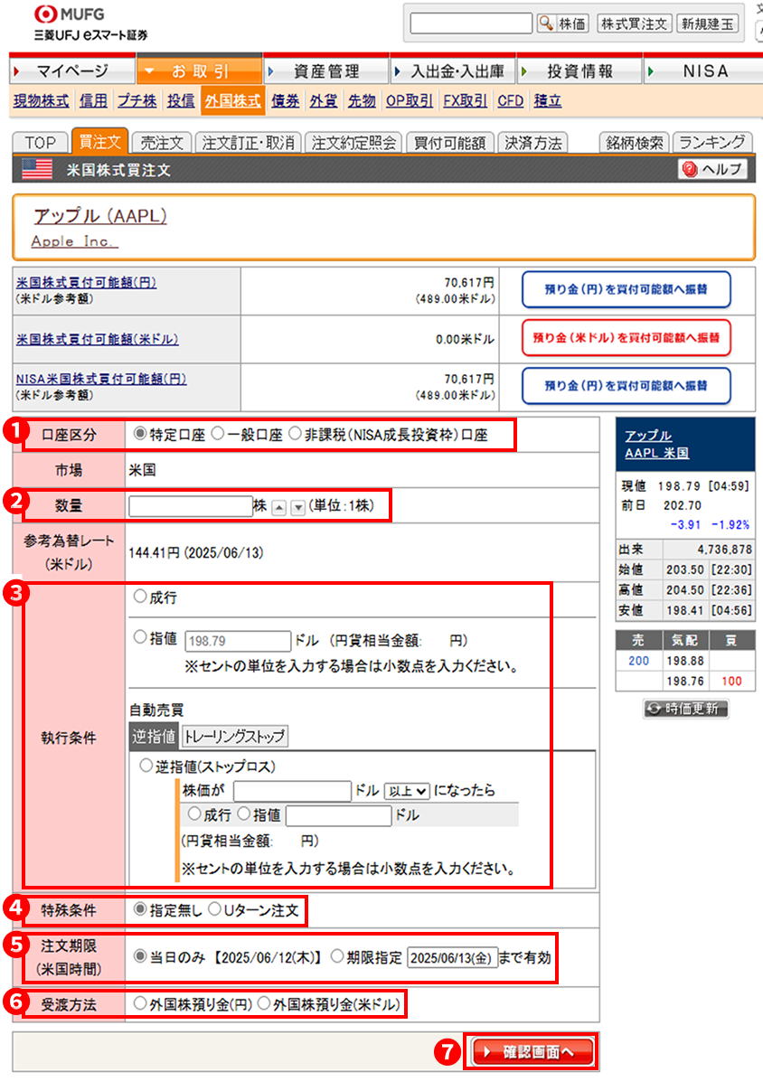 「米国株式買注文」で各項目を入力