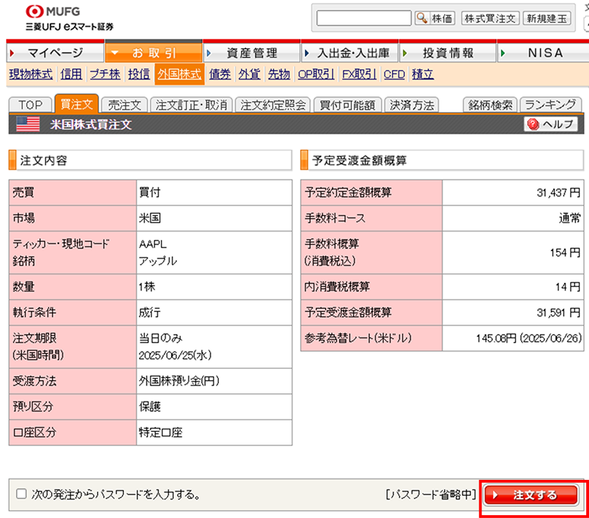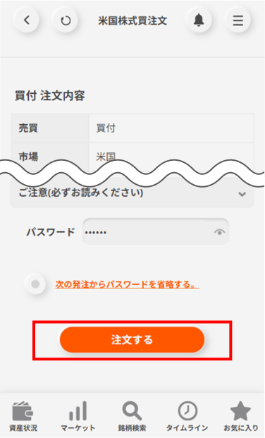 注文内容を確認しパスワードを入力のうえ「注文する」ボタンを押下すると注文が発注されます。