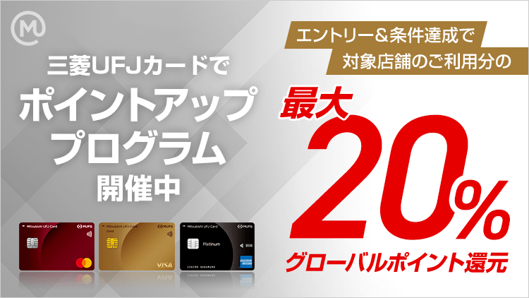 - ポイント付与の対象カードは、三菱UFJカード、三菱UFJカード ゴールド、三菱UFJカード・プラチナ・アメリカン・エキスプレス®・カードの3種類です。