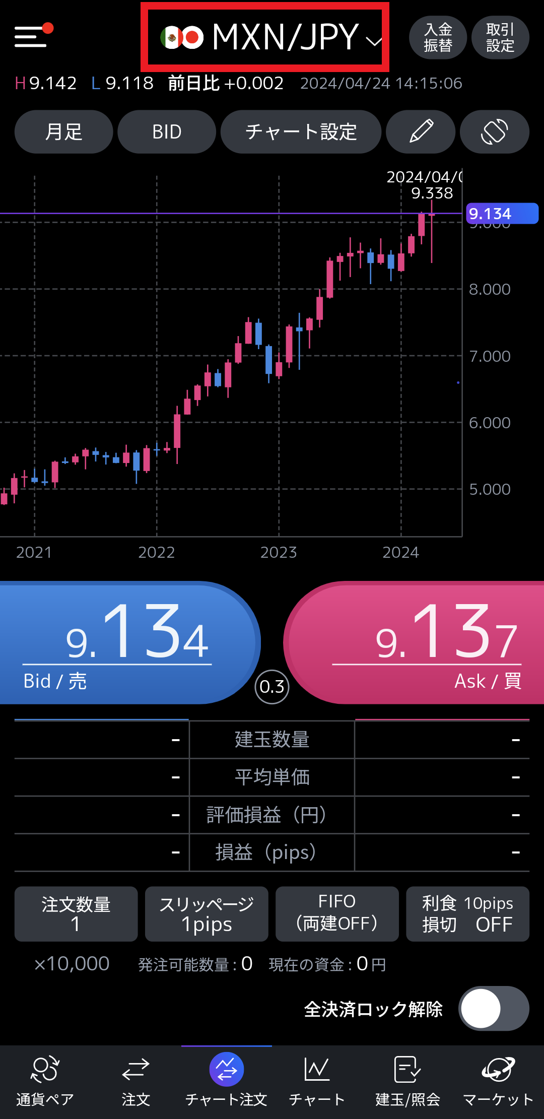 通貨ペア「MXN/JPY」を選択し、買い注文を出す。