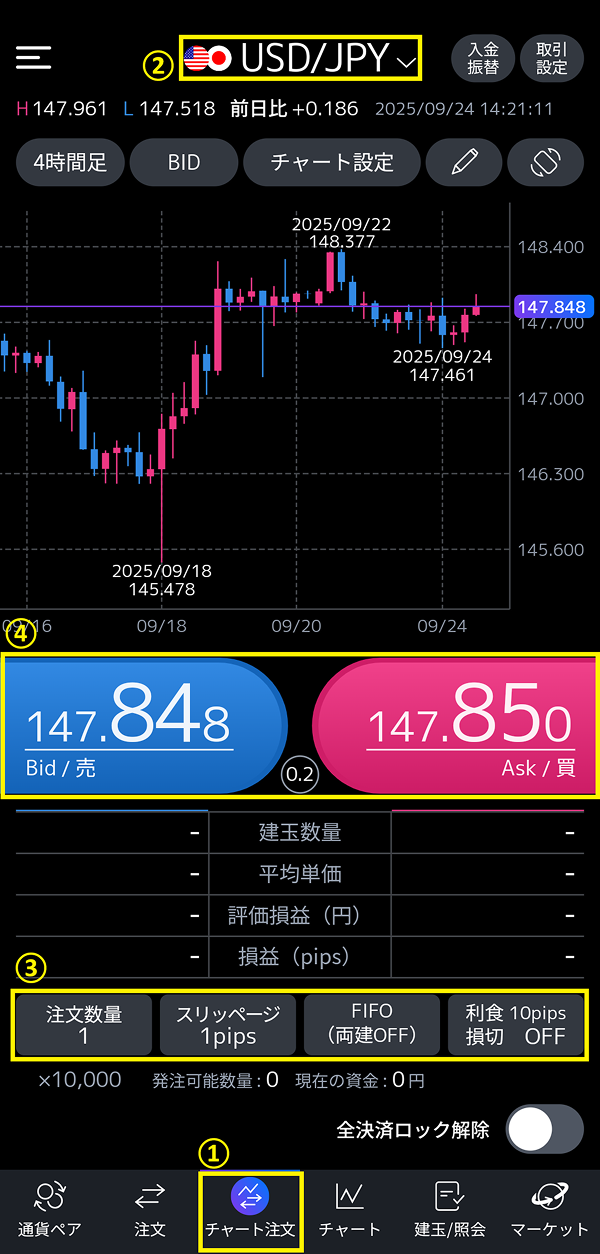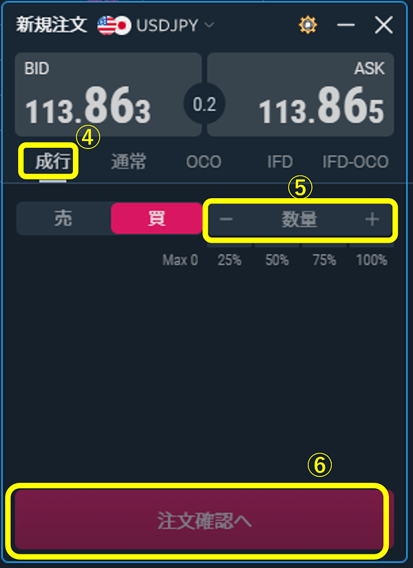 ④ 売り注文の場合は青いプライスボタン「売」、買い注文の場合は赤いプライスボタン「買」をタップして注文します。