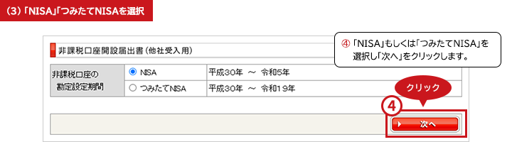 以降のお手続きは、新たにNISA口座を開設する金融機関の手続きに準じます。手順については当該金融機関にご確認ください。