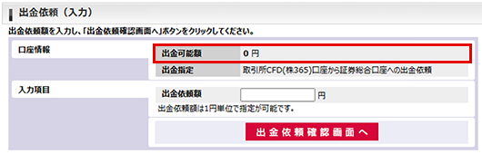 - 取引所CFD(株365)の証拠金は、取引所CFD(株365)取引画面→「口座管理」→「出金依頼」画面の振替可能額で確認できます。