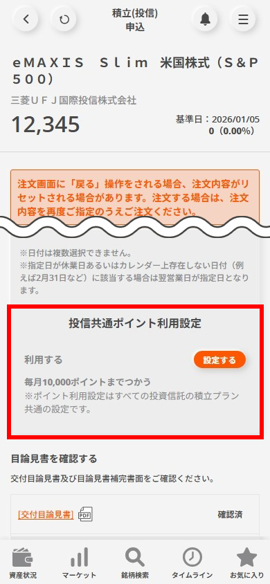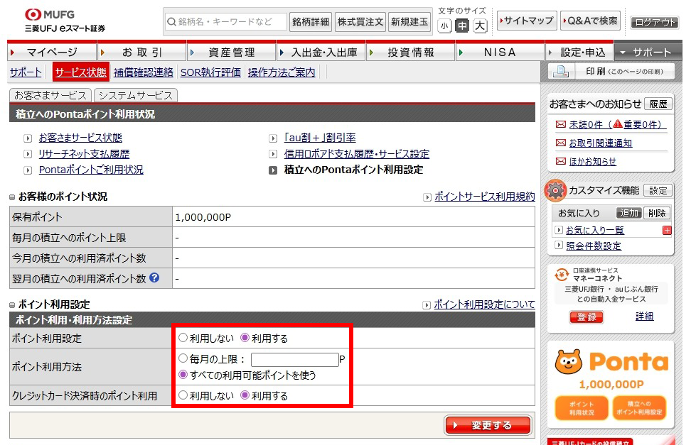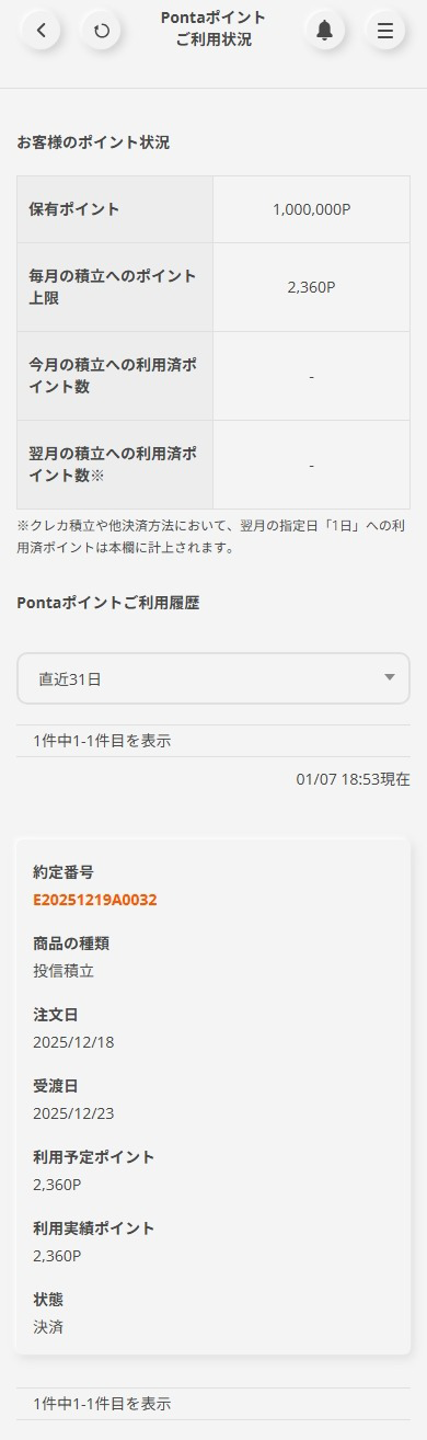 | ポイント利用設定 (投資信託の積立のみ) | 【ポイント利用設定】 画面より、以下のどちらかを選択します。 ①ポイントをすべて利用する ⇒積立発注時に保有しているすべてのPontaポイントを充当します。 ②毎月の利用上限を設定する ⇒お客さまの設定上限内でPontaポイントを充当します。さらにクレジットカード決済の場合には[ポイントを利用する]/[利用しない]のどちらかを選択いただけます。