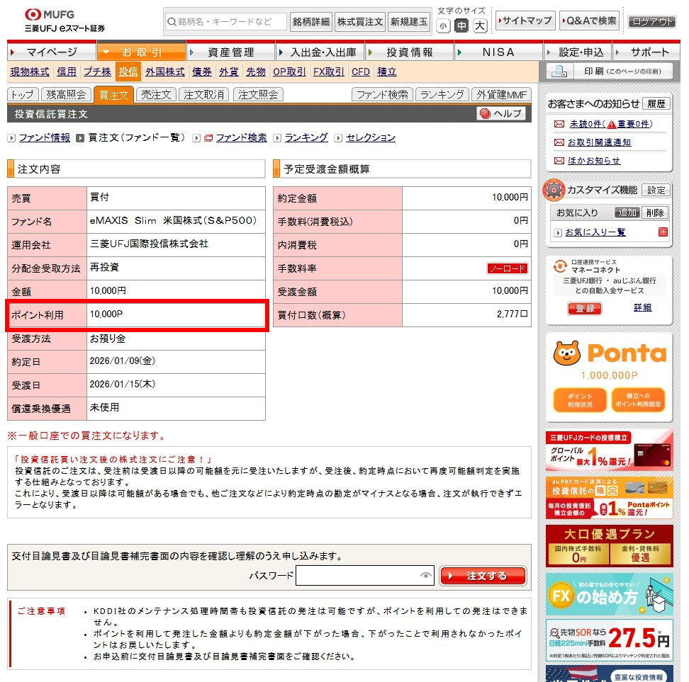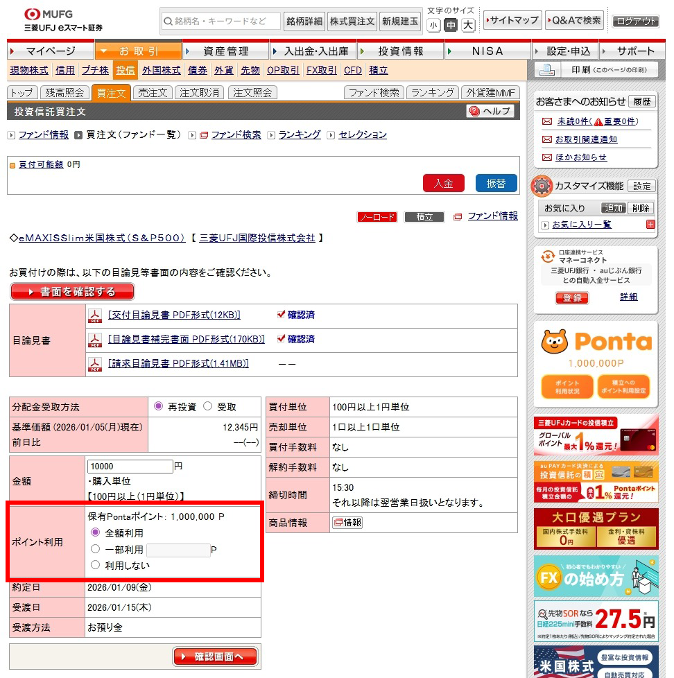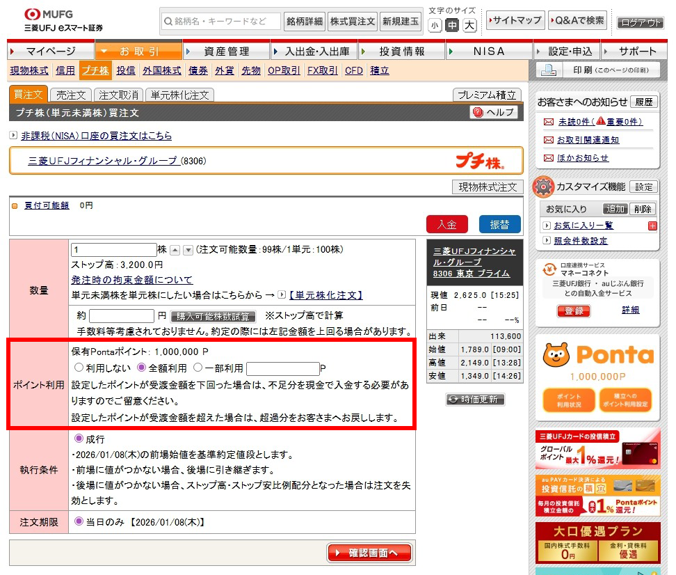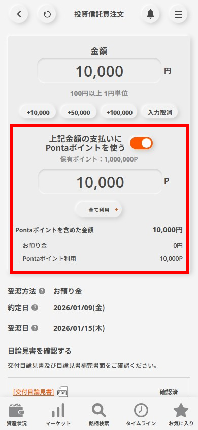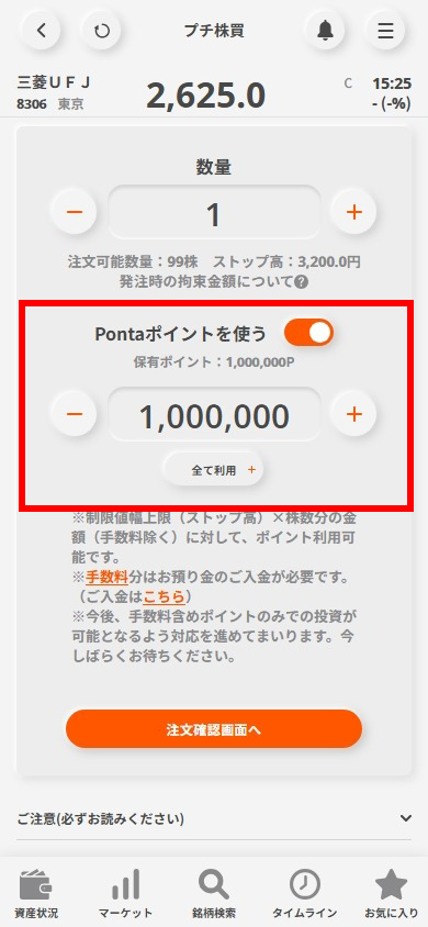 買付画面で[上記金額の支払いにPontaポイントを使う]を選択して任意のポイントを入力後[注文確認画面へ]を押下します。