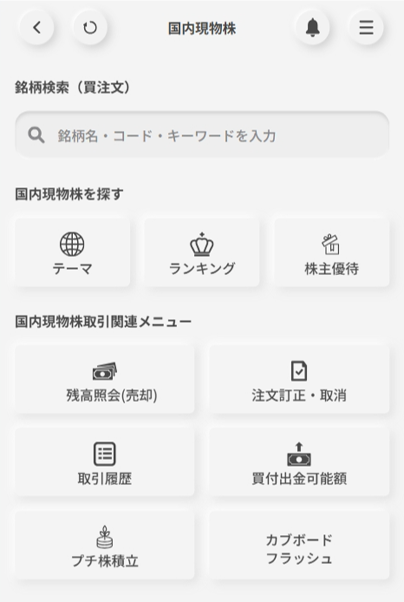ご自身の資産を確認できる画面です。現物株式を購入後の評価損益や、株式等を買付可能な金額、銀行への出金可能な金額等をご確認いただけます。