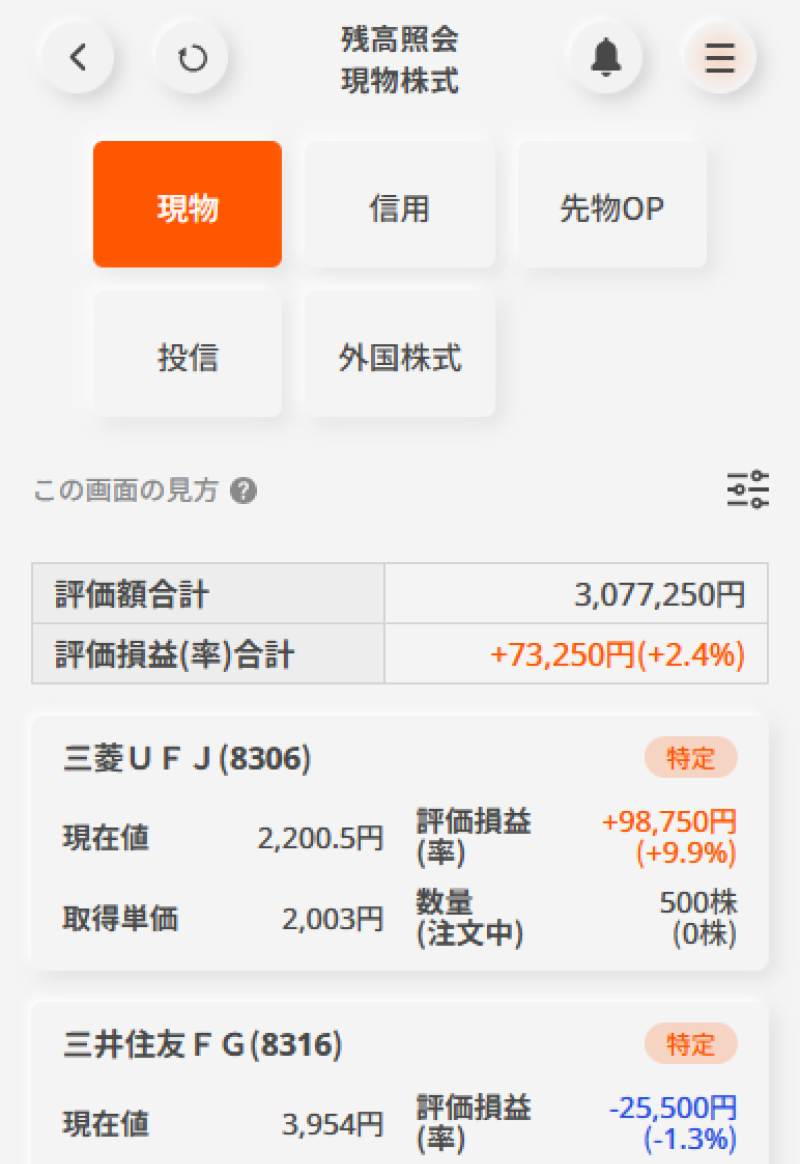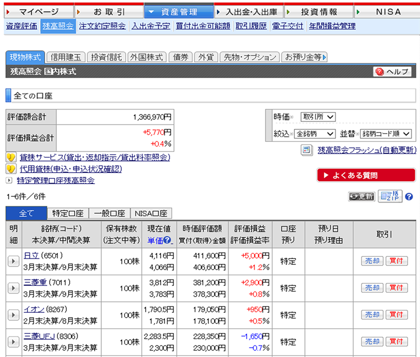 残高照会画面で、現在保有中の銘柄を一覧でご確認いただけます。株価が下がっていないか等、評価損益をご確認いただける他、売却注文や買い増しの注文も可能です。自分の資産は毎日チェックをしましょう。