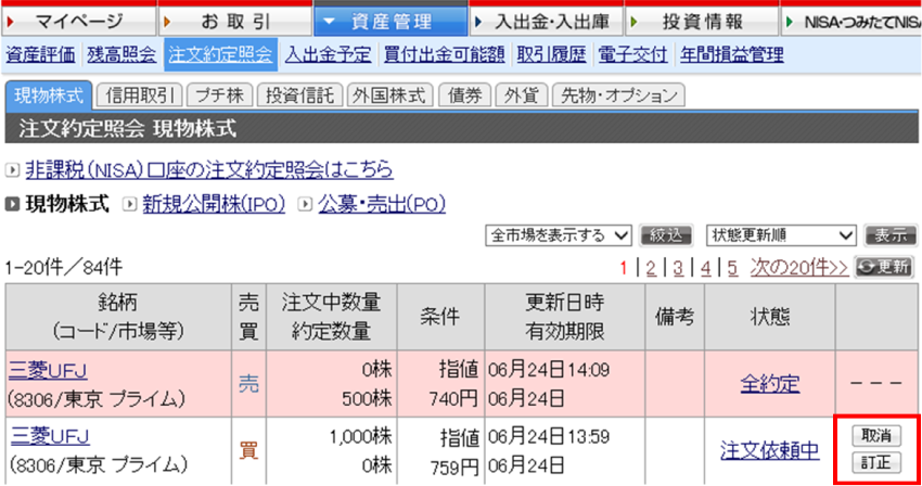 注文約定照会画面を開き、注文の右側にある「取消」ボタン「訂正」をクリックします。