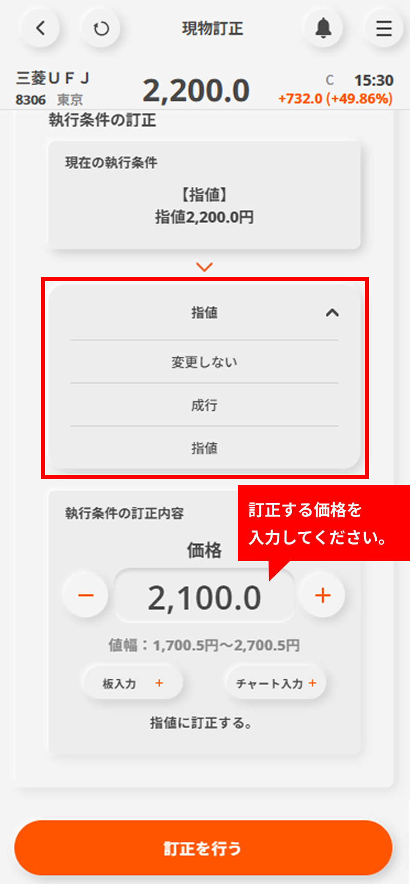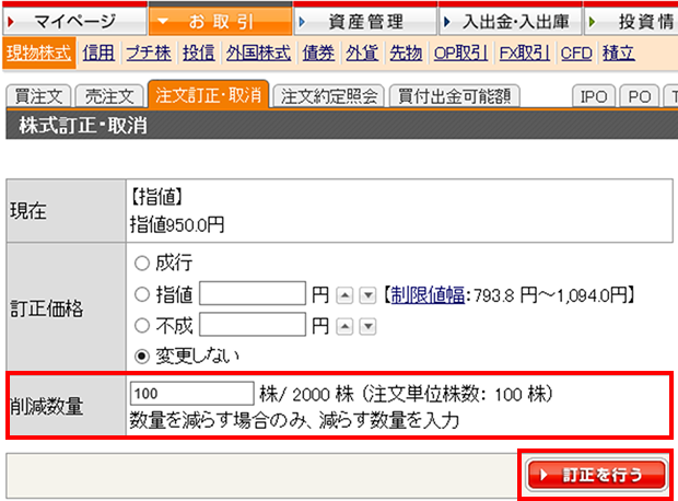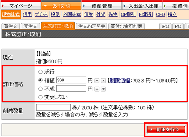例えば、指値950円→930円へ訂正する場合、指値の左側をチェックし、訂正したい価格を入力します。