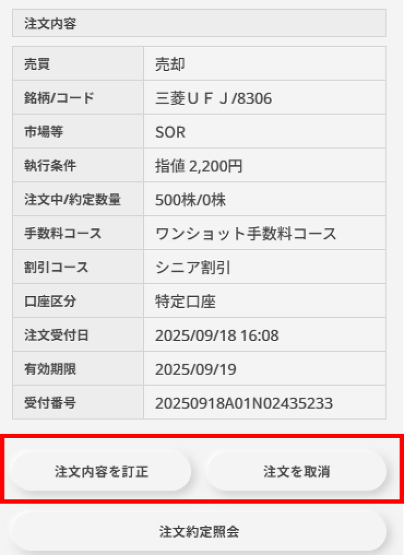 - 「注文訂正・取消」画面に表示されないご注文は、訂正・取消ができません。