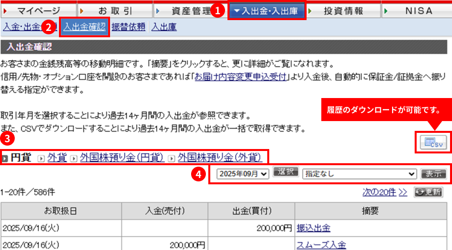 この画面では、「円貨」の入出金に加え、「外貨」および「外国株預り金(円貨・外貨)」の明細も確認できます。③部分で切替を行い、確認してください。