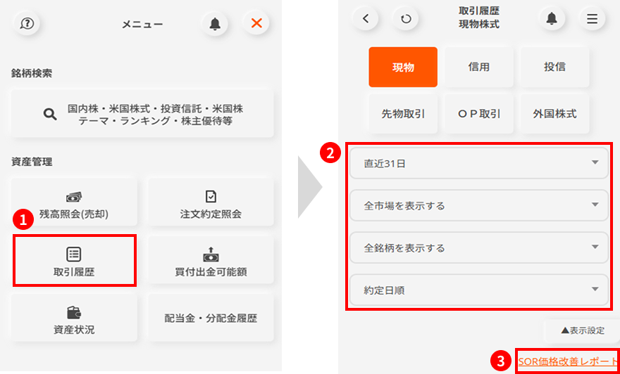 ④SOR価格改善レポートでは、SORをご利用いただいた注文の価格改善効果のレポートを確認できます。