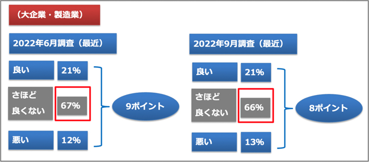 2022年9月の調査(大企業、製造業)によると、「良い」が21%、「さほど良くない」が66%、「悪い」が13%で、業況判断DIは21-13=8ポイントでした。前回6月の調査が9ポイントであったため、1ポイントの「悪化」となりました。仮に前回が7ポイントなら、1ポイントの「改善」となります。