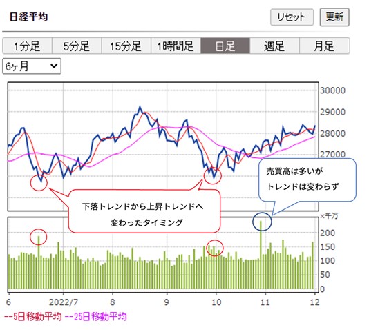 山になったり谷になったりしていますが、その転換のタイミングは、下の棒グラフにある売買高が多くなった時に起こりやすくなっています。