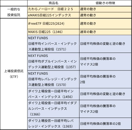 また、上級者向きとしては、レバレッジが効いているものや、日経平均とは逆の動きをするものもよいでしょう。