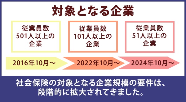 社会保険料の加入適用条件は、段階的に広がってきています。2016年10月からは従業員501人以上の企業、2022年10月からは従業員101人以上の企業が社会保険料の加入対象でした。