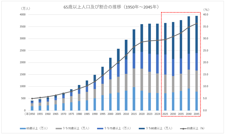 「2025年問題」という言葉を聞いたことはありますか?これは「団塊の世代」が全員75歳以上(後期高齢者)となることで、人口の約5人に1人が後期高齢者になることから生じる様々な問題を示しています。