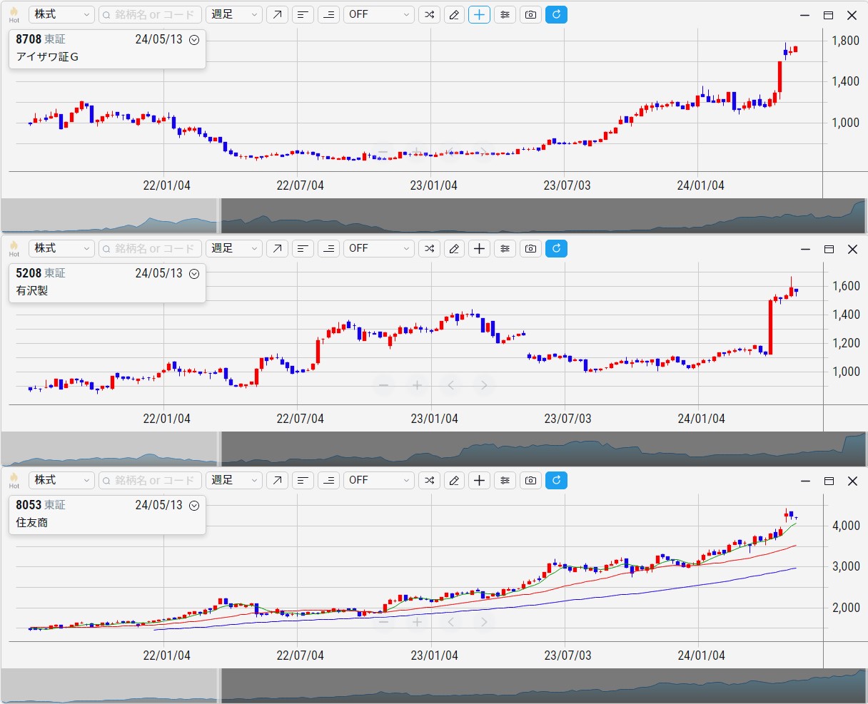 大型株では住友商事(8053、第46位、3,652円→4,155円、+13.8%)も、5月2日の決算発表に合わせて、新しい中期経営計画と自社株買い(1900万株、500億円)を発表して株価が急上昇しています。