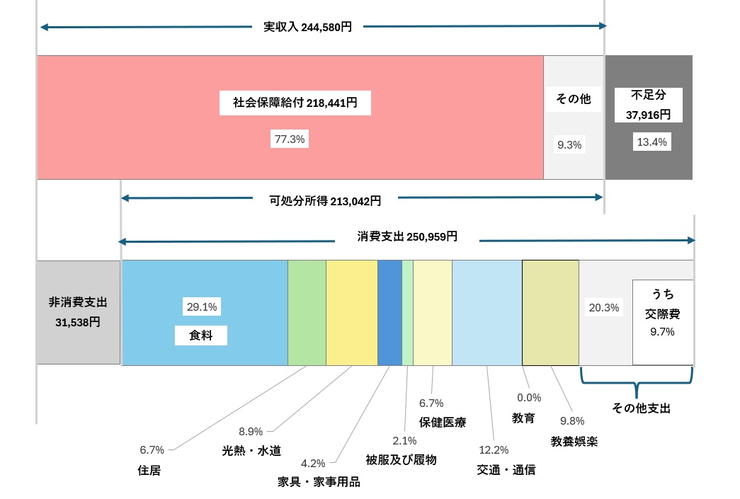 1 図中の「社会保障給付」及び「その他」の割合(%)は、実収入に占める割合である。