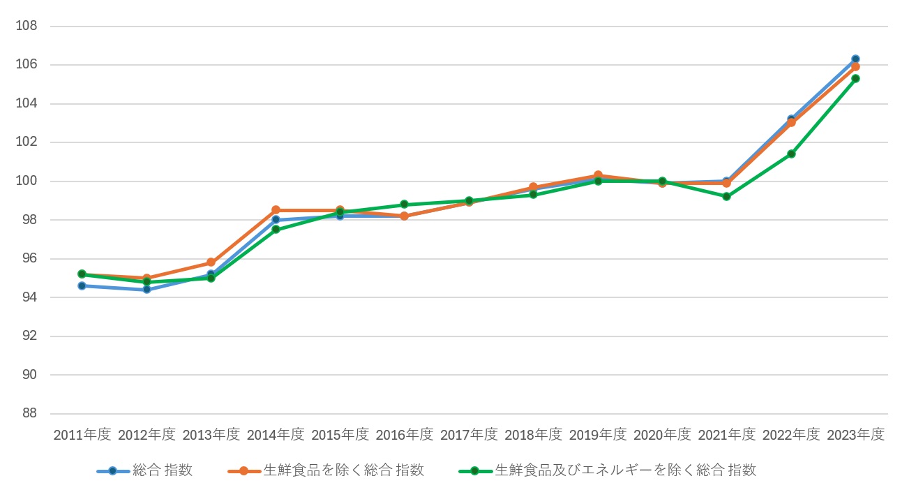 統計局のデータによれば、2023年度の消費者物価指数は2022年度と比べて平均で3.0%の上昇が見られました。今後の物価がどのように変動するかはわかりませんが、少なくともここ数年において物価が上昇し続けているのは事実です。