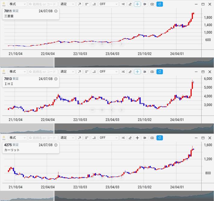 弾丸などの火薬を製造するカーリット(42754275、第50位、1,219円→1,447円、+18.7%、341億円)も堅調です。