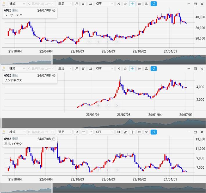しかしアドバンテストのような動きは半導体関連株の中ではむしろ例外で、いまだ総じて調整局面の中にあると見られます。