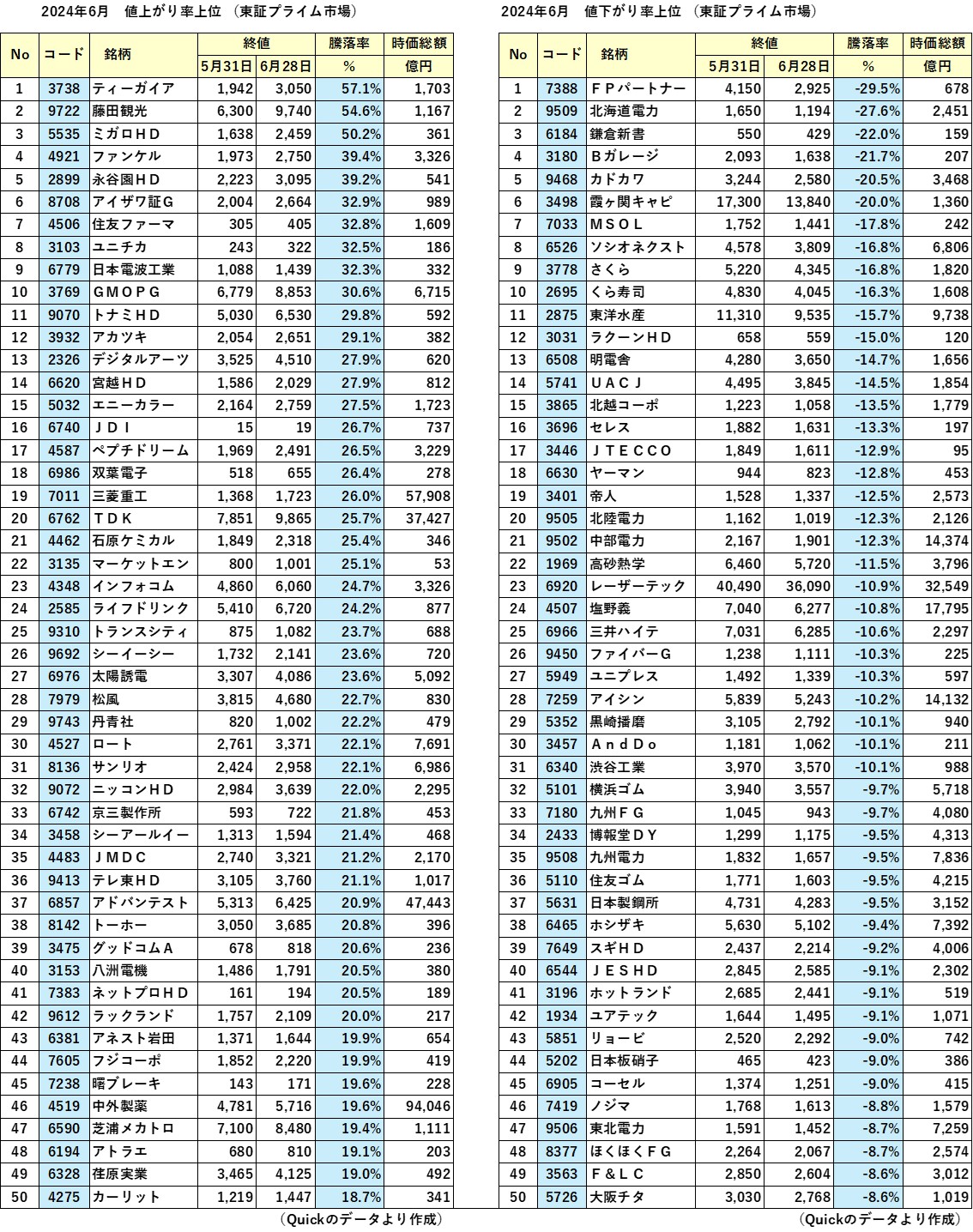 6月の上昇率ランキングのトップ、ティーガイア(37383738、第1位、1,942円→3,050円、+57.1%、1,703億円)は携帯販売代理店です。