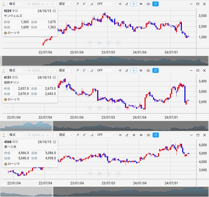 第一三共(45684568、第5位、6,108円→4,709円、▲22.9%)も、英国のアストラゼネカと共同開発する乳がんの治療薬「ダトポタマブ デルクステカン」が最後の臨床試験で有意な結果が得られなかったと発表したことから株価が下落しました。