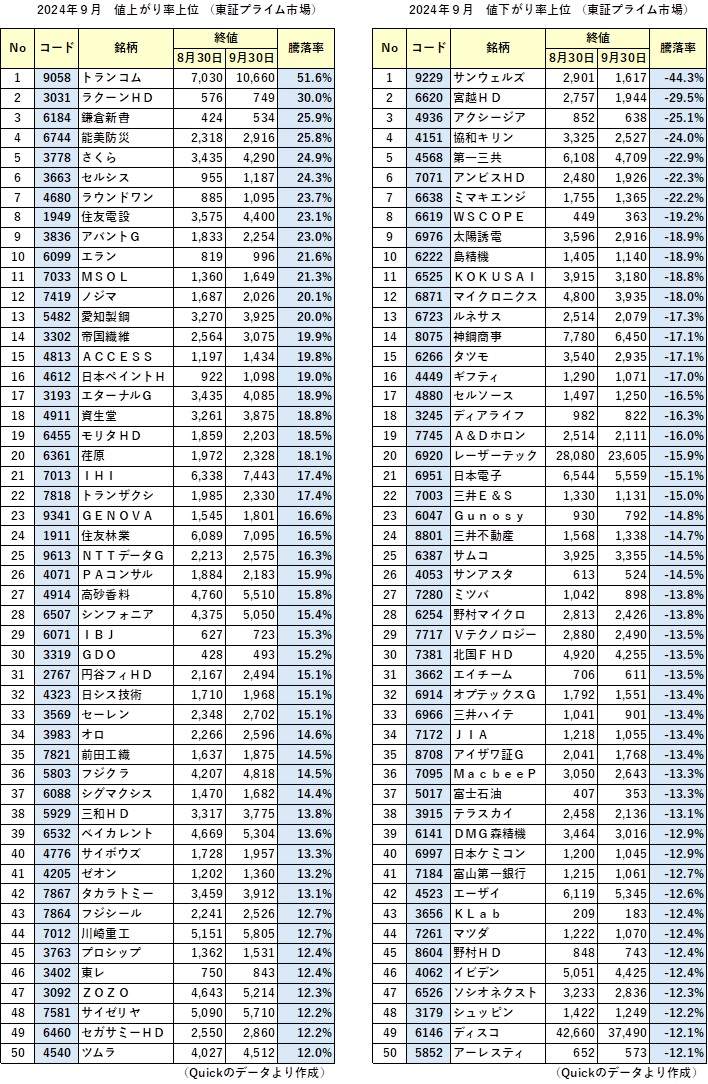 続いて9月相場で下落が目立った銘柄、「COOLな銘柄」です。