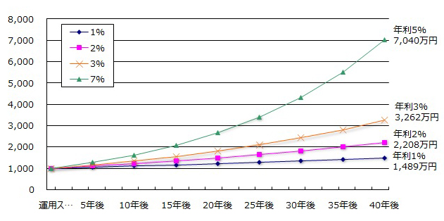 図は、1000万円を年利回り1%、2%、3%、5%で40年間複利運用した結果を比較したものです。運用期間が5年程度では、それほど大きな違いにはなりませんが、20~30年以上たつと1~2%の差が大きな金額差につながっていることがわかります。