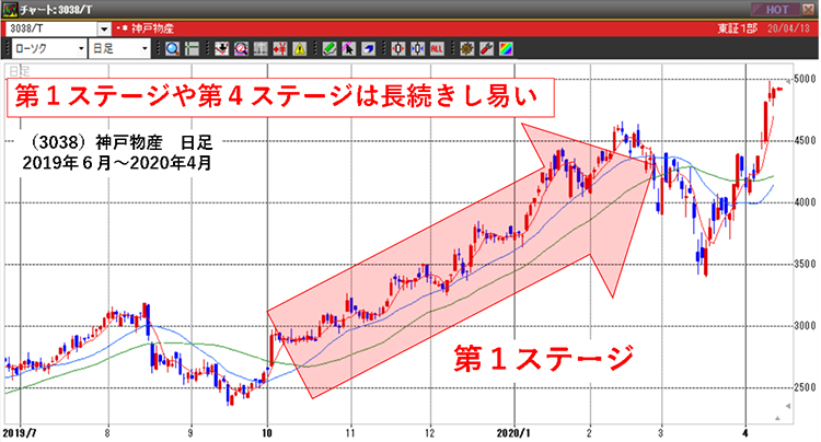 (3038)神戸物産、のチャートを見ると、上昇トレンドが継続している間は第1ステージのままとなっており、押し目や調整局面になってくるとステージが変化しているのが分かります。