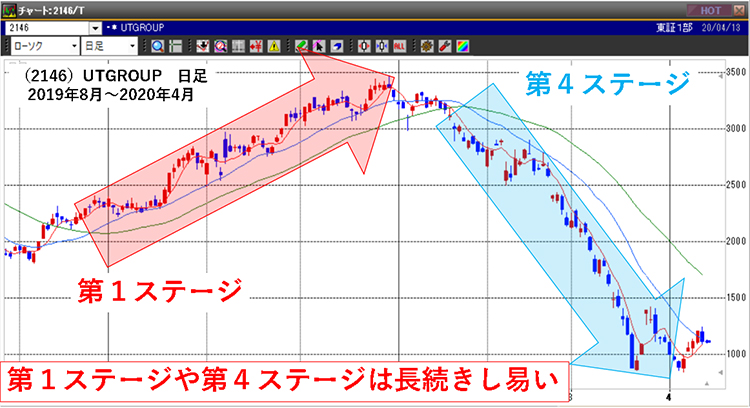 (2146)UTGROUPは上昇期から下降期へと移行していますが、綺麗にステージが第1ステージ→第2ステージ→第3ステージ→第4ステージへと移行してトレンド転換しています。安定上昇の時期には買いポジションで、安定下降の時期は売りポジションで臨みます。