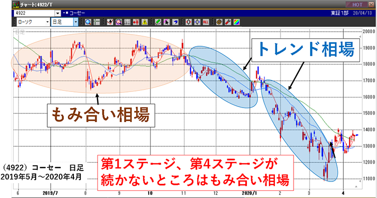(4922)コーセー、のチャートを見ると、もみ合い相場とトレンド相場の違いが一目で分かります。ステージが直ぐに変化しているところがもみ合い相場です。初心者の方や中級者の方は、こういったもみ合い相場のところでも、もみ合い相場と気づかずに何とか利益を上げようとしてしまうのです。ステージが直ぐに変化するところはもみ合い相場であると理解できれば、ここは方向感のはっきりしない時期であり、ここで仕掛けると、いわゆる「だまし」にあう可能性も高いので、トレードは避けるという選択肢を取ることもできます。このように移動平均線大循環分析を使っていくことで大相場をしっかりと狙うことができるようになります。